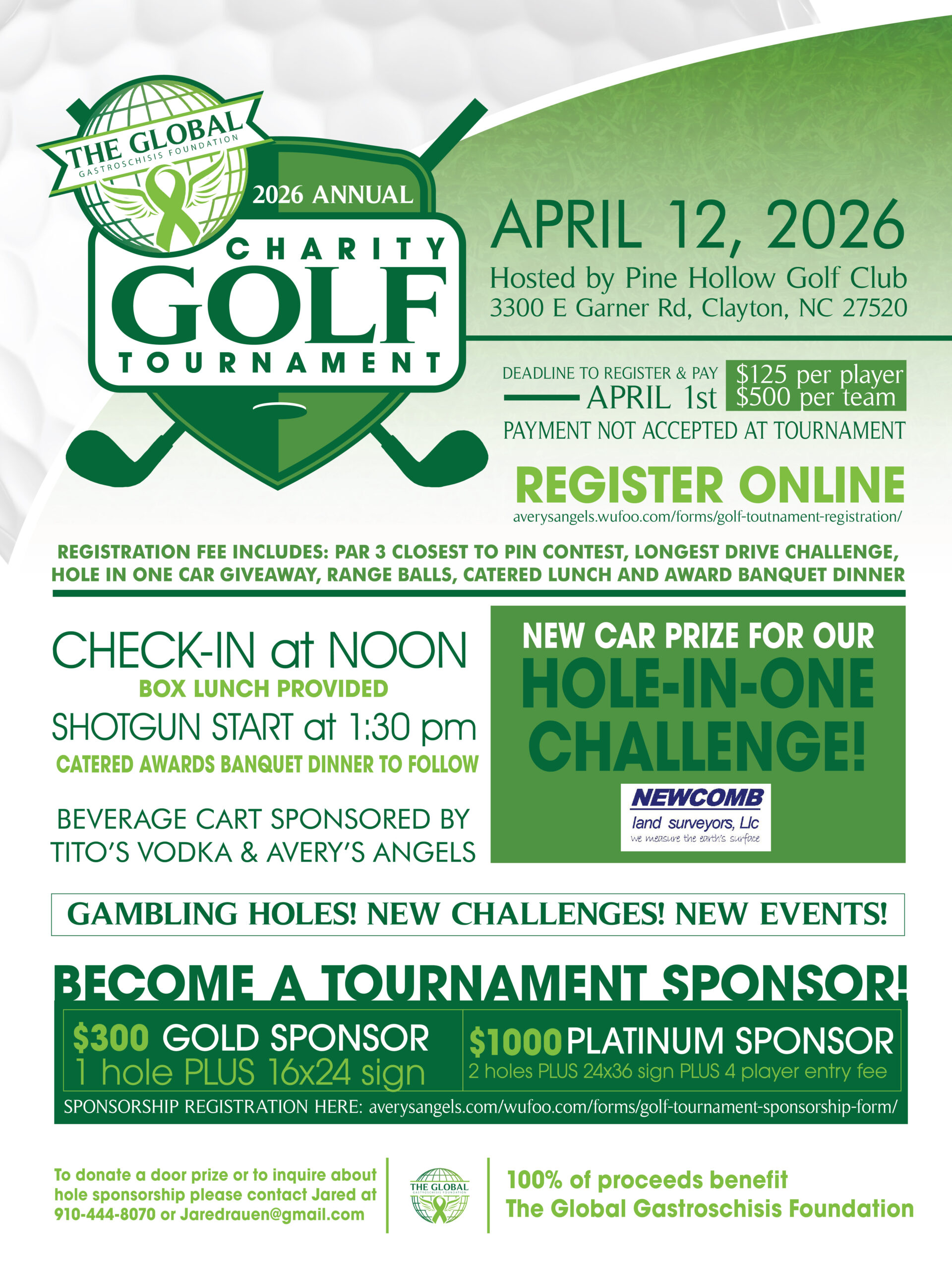 The Global Gastroschisis Foundation is partnering with Pine Hollow Golf Club to bring you this charity golf tournament on Sunday April 12, 2026. Your participation in this event is much more than a leisurely day of golf. Your entry fee and any additional donations will directly benefit The Global Gastroschisis Foundation, and are 100% tax-deductible.